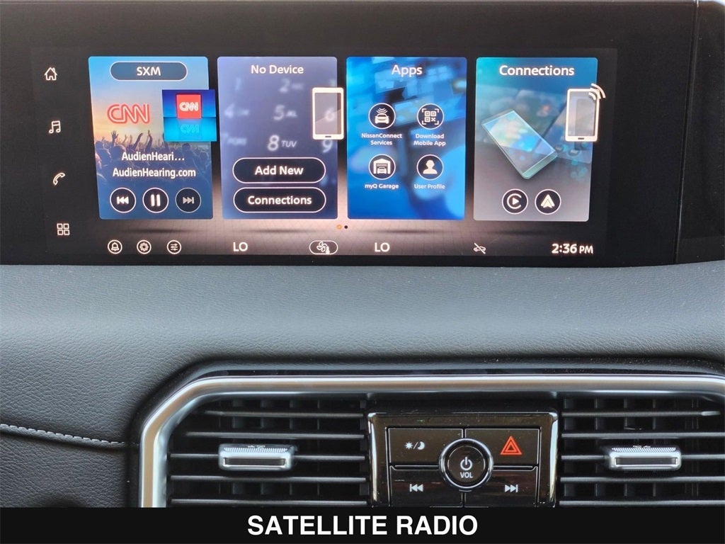 - Radio: NissanConnect w/SiriusXM 360L -inc: 6 speakers w/advanced audio features, 12.3" center touch-screen display, wireless Apple CarPlay and Android Auto, Bluetooth® hands-free phone system, Siri Eyes Free, hybrid radio, 5G capability, 2 USB type-C connection ports in front, Amazon Alexa w/Hotword, voice recognition and system controlled navigation w/traffic information