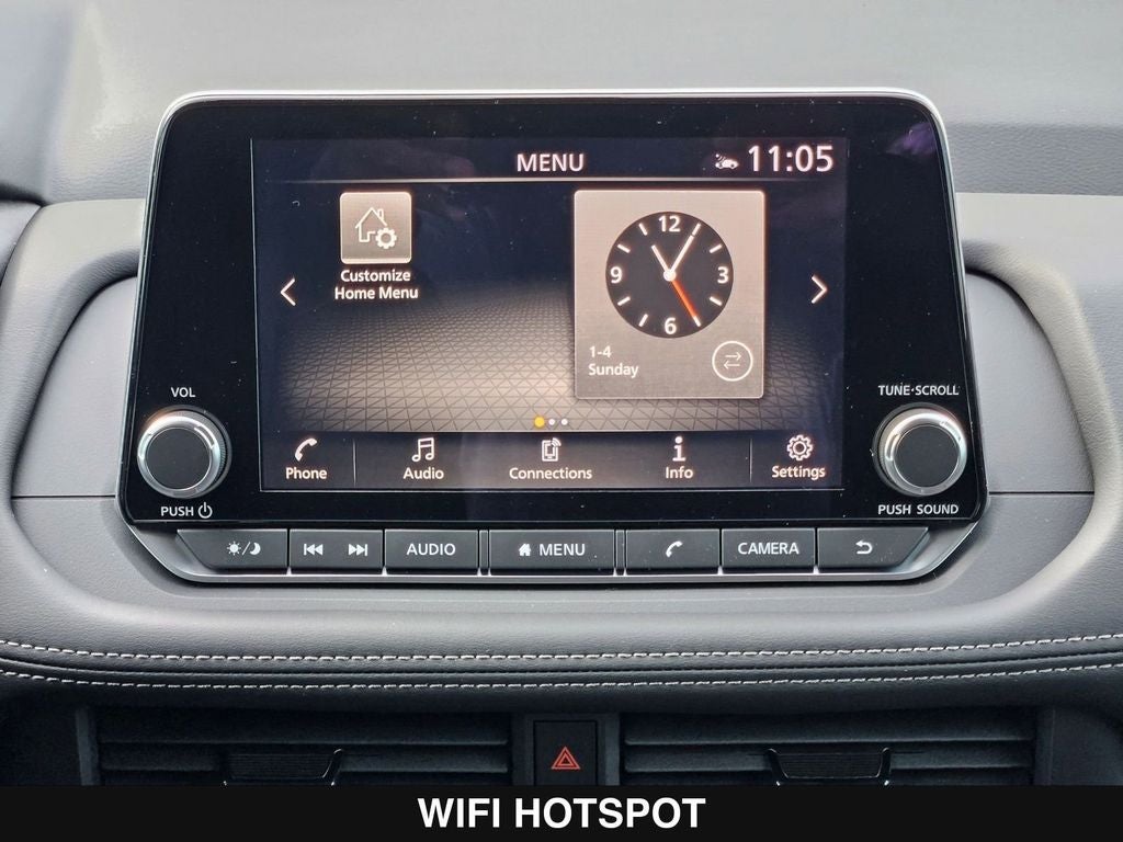 - Radio: AM/FM NissanConnect -inc: 6 speakers plus 2 tweeters, Apple CarPlay, Android Auto, 8" color touch screen display, Bluetooth®, 2 front USB type-C, Wi-Fi hotspot and NissanConnect Services powered by SiriusXM