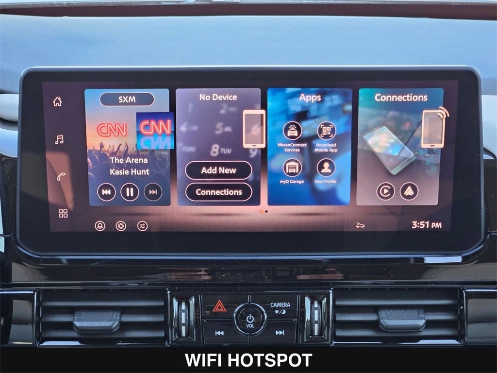 - Radio: AM/FM Audio System w/NissanConnect -inc: 6 speakers, 5G Wi-Fi hotspot, wireless Apple CarPlay and Android Auto, 12.3" multi-function information display, SiriusXM satellite radio, 2 front USB connection (1 type C charge and data ports), Bluetooth® hands-free phone system, streaming audio and messaging and hands-free text messaging assistant