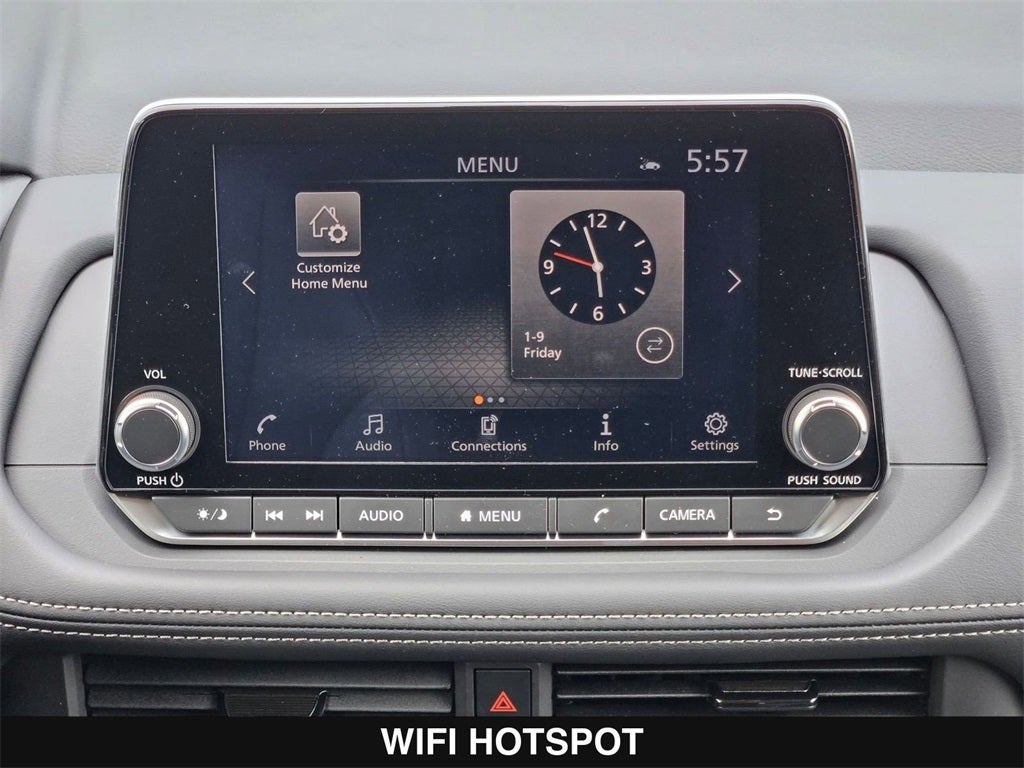 - Radio: AM/FM NissanConnect -inc: 6 speakers plus 2 tweeters, Apple CarPlay, Android Auto, 8" color touch screen display, Bluetooth®, 2 front USB type-C, Wi-Fi hotspot and NissanConnect Services powered by SiriusXM