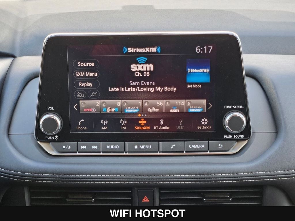 - Radio: AM/FM NissanConnect -inc: 6 speakers plus 2 tweeters, Apple CarPlay, Android Auto, 8" color touch screen display, Bluetooth®, 2 front USB type-C, Wi-Fi hotspot and NissanConnect Services powered by SiriusXM