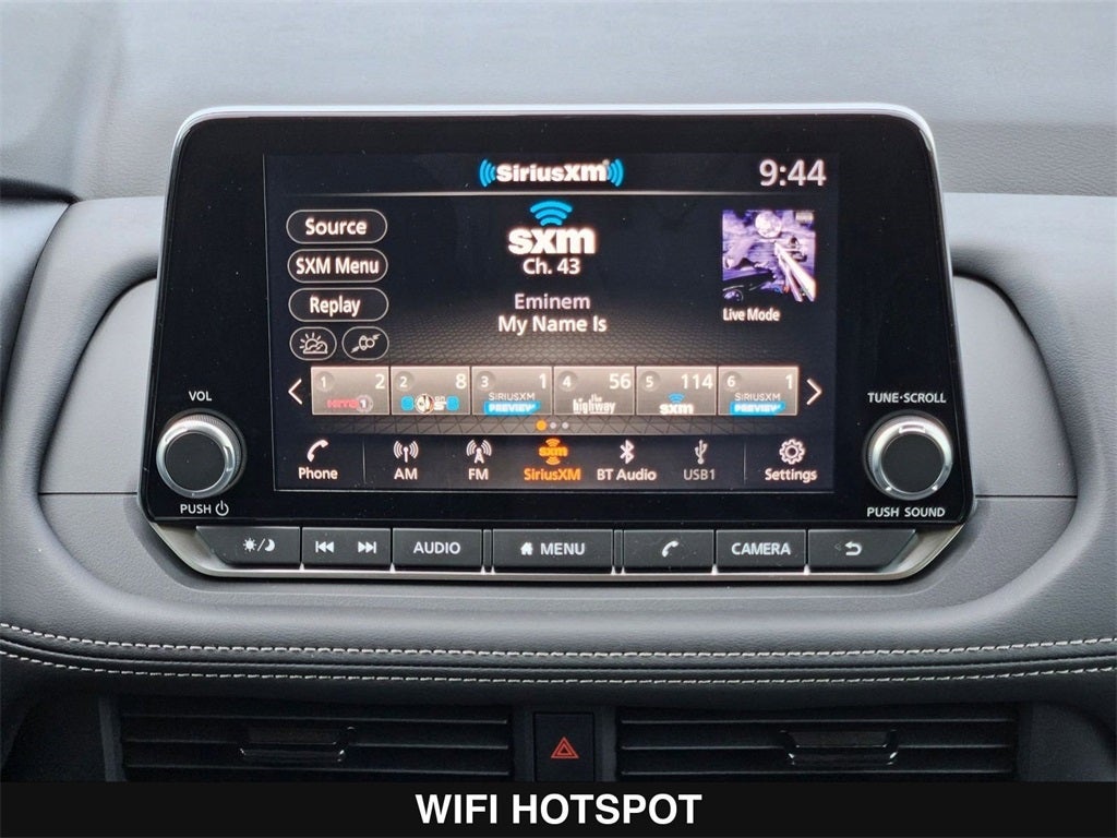 - Radio: AM/FM NissanConnect -inc: 6 speakers plus 2 tweeters, Apple CarPlay, Android Auto, 8" color touch screen display, Bluetooth®, 2 front USB type-C, Wi-Fi hotspot and NissanConnect Services powered by SiriusXM