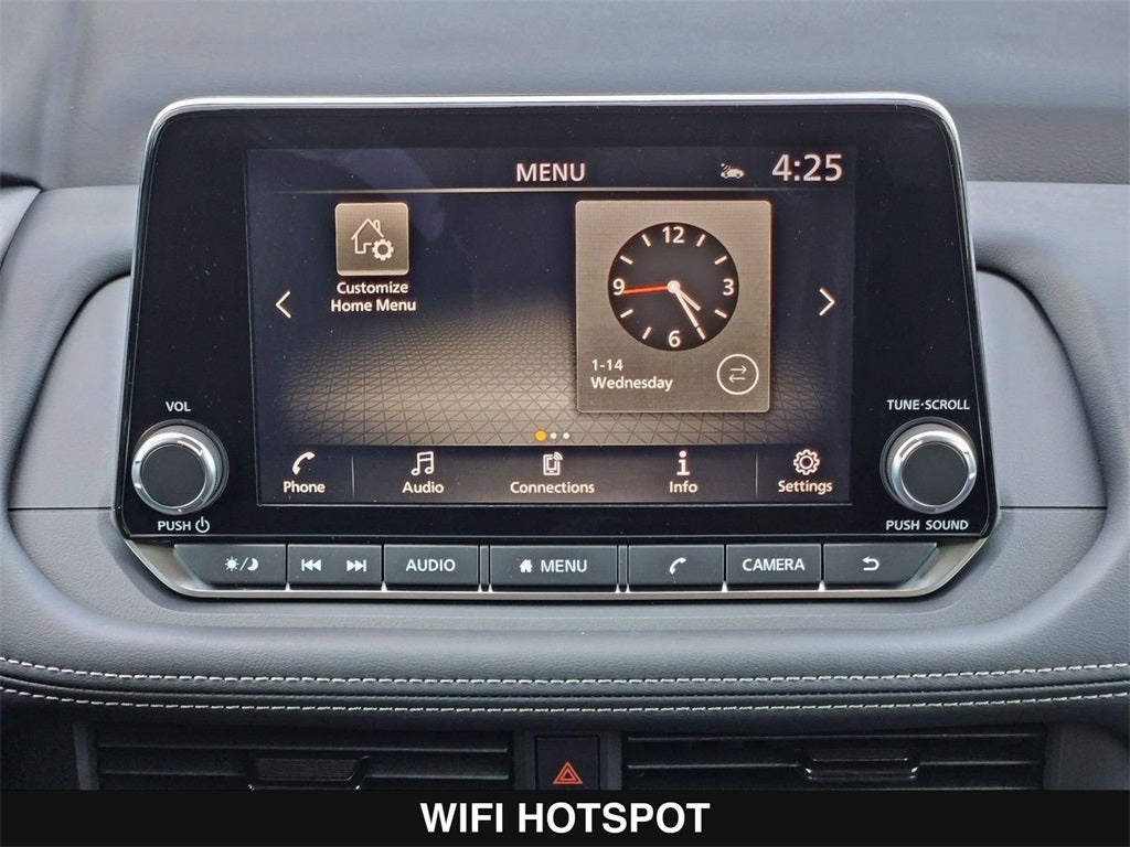 - Radio: AM/FM NissanConnect -inc: 6 speakers plus 2 tweeters, Apple CarPlay, Android Auto, 8" color touch screen display, Bluetooth®, 2 front USB type-C, Wi-Fi hotspot and NissanConnect Services powered by SiriusXM