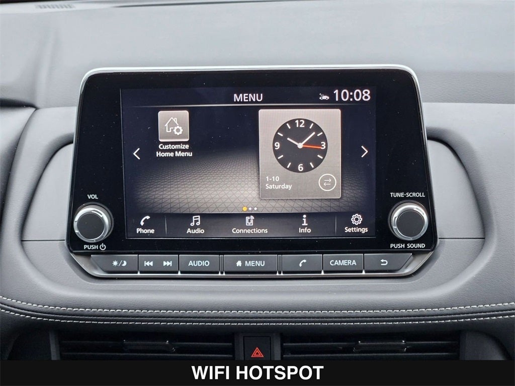 - Radio: AM/FM NissanConnect -inc: 6 speakers plus 2 tweeters, Apple CarPlay, Android Auto, 8" color touch screen display, Bluetooth®, 2 front USB type-C, Wi-Fi hotspot and NissanConnect Services powered by SiriusXM
