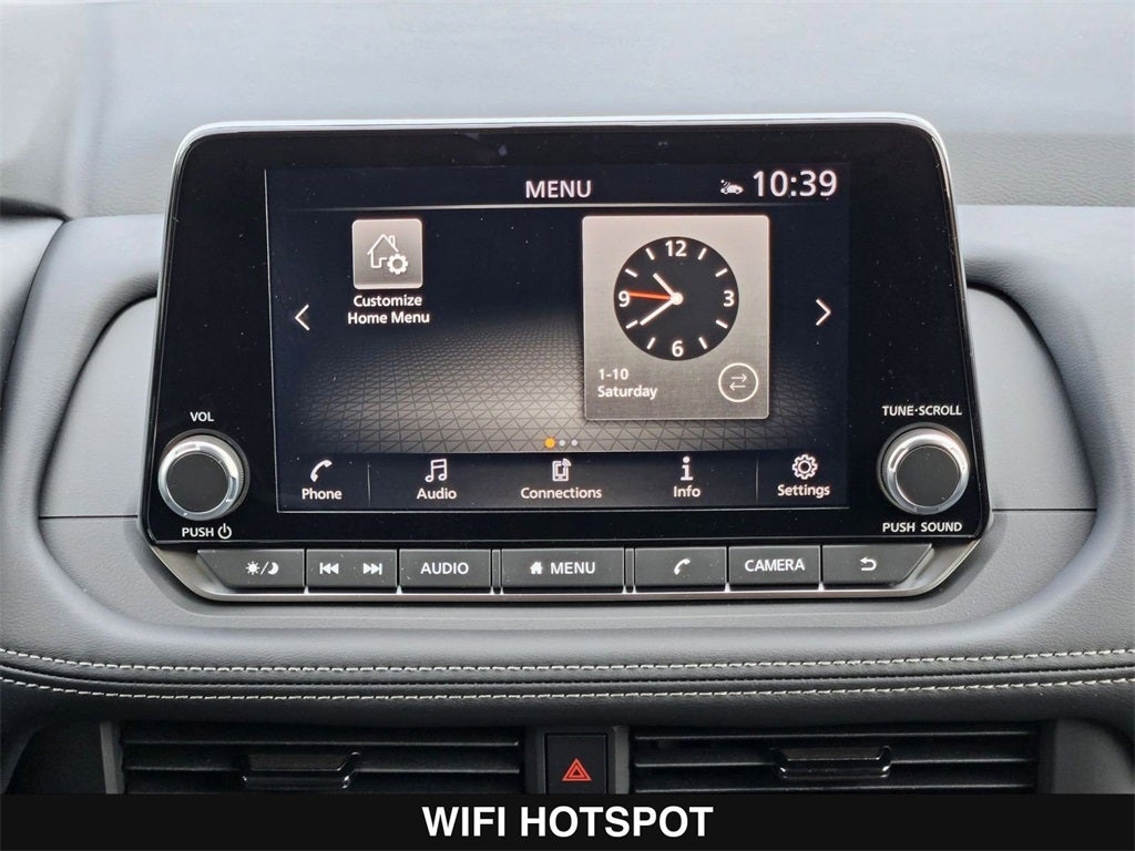 - Radio: AM/FM NissanConnect -inc: 6 speakers plus 2 tweeters, Apple CarPlay, Android Auto, 8" color touch screen display, Bluetooth®, 2 front USB type-C, Wi-Fi hotspot and NissanConnect Services powered by SiriusXM