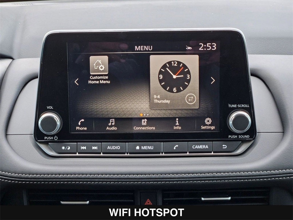 - Radio: AM/FM NissanConnect -inc: 6 speakers plus 2 tweeters, Apple CarPlay, Android Auto, 8" color touch screen display, Bluetooth®, 2 front USB type-C, Wi-Fi hotspot and NissanConnect Services powered by SiriusXM
